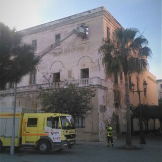 Los bomberos intervinieron ayer en la fachada trasera del antiguo Hospital de San Juan de Dios ante la caída y desprendimiento de cascotes de la estructura del edificio. Se trata de una imagen que ya se ha dado en otras ocasiones y que se repite tras el temporal sufrido días atrás.