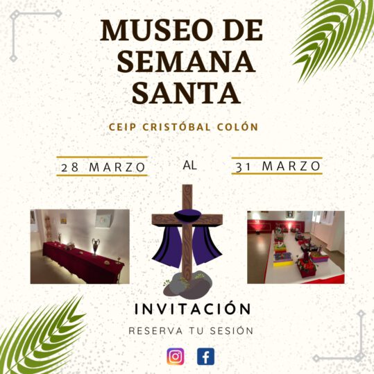 El CEIP Cristóbal Colón realiza por segundo año consecutivo un Museo de Semana Santa. Se trata de una exposición en el que muestran los pasos en miniaturas que ha estado realizando el alumnado de 5º y 6º curso como parte de un proyecto en el área de Religión Católica. A esto hay que sumarle todas las piezas y obras que algunas hermandades y cofrades de nuestra ciudad ceden al colegio para la ocasión.