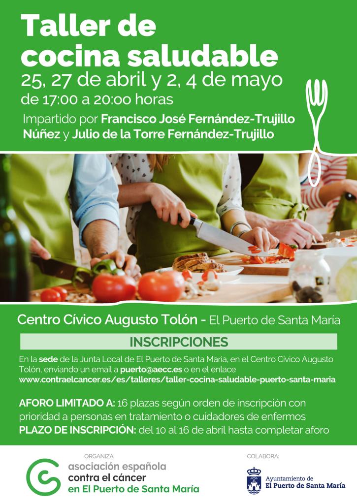 Las personas interesadas en asistir podrán inscribirse presencialmente en la sede de la Junta Local de El Puerto de la AECC, sita en calle Pedro Muñoz Seca, 9, 3ª planta, o en el Centro Cívico Augusto Tolón, o bien enviar un email a la dirección puerto@aecc.eso dirigirse al enlace https://www.contraelcancer.es/es/talleres/taller-cocina-saludable-puerto-santa-mariateniendo en cuenta que el plazo de inscripción se extiende del 10 al 16 de abril, que el horario de las clases, gratuitas y de carácter teórico y práctico, es de 17:00 a 20:00 horas y que el aforo se limita a 16 plazas, que se cubrirán según orden de inscripción, con prioridad a personas en tratamiento o cuidadores de enfermos. La dirección web incluye una completa información de la actividad.
